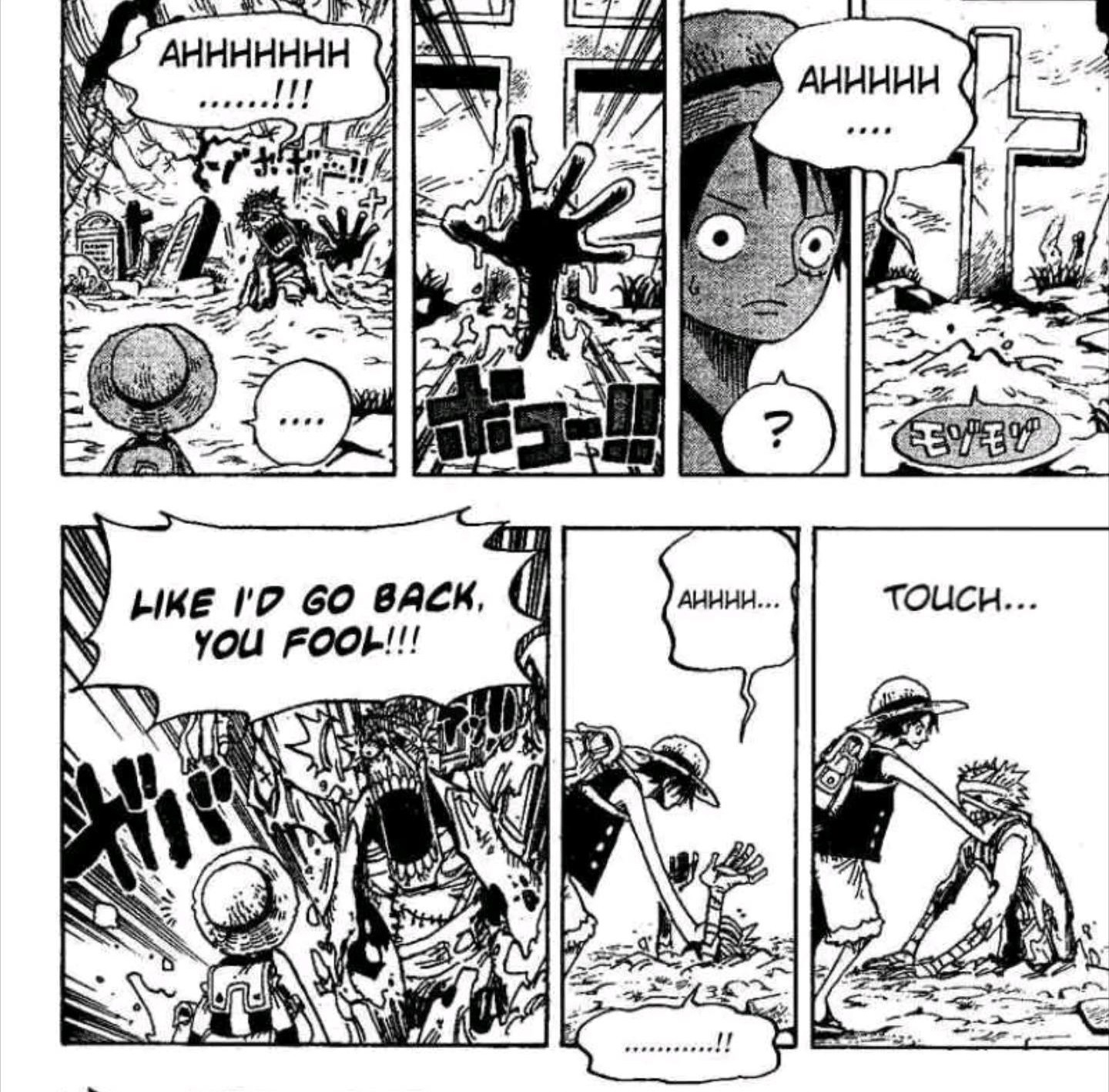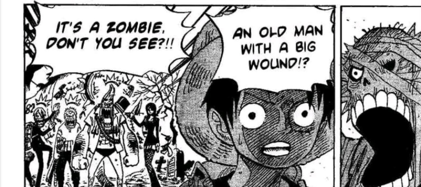 (ONE PIECE) One Piece is a shonen manga about pirates that's famous for being over 1,000 chapters long. before i read it, i didn't really know that it was funny. it is, after all, an action-adventure story! i knew there'd be comic relief, but i wasn't expecting to be so stunned by some of the jokes. many of them come as a punchline to literal years of careful plotting (seriously!) and so they're a little too complex or spoiler-y to share here. but this joke, from a story arc that lands the pirate crew on a horror-themed island called Thriller Bark, stands completely on its own. here's foolhardy protagonist Monkey D. Luffy encountering a zombie for the first time: ![]() what a perfect zombie joke. i couldn't believe nobody's ever done it before. a brave idiot, when faced with a zombie, would just... push it back down into the ground. the obvious solution we've all been missing for years. for fun, here's the button on the joke that clarifies how unfamiliar Luffy is with the concept of zombies: ![]() and of course, since this has been adapted into an anime, you can take a look at the same joke translated into animation: ![]() |